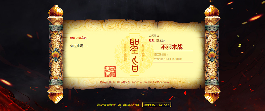 2、新服开服7天内,老服从2019年11月1日起累计达到5000元、10000元、20000元可参加冠名(平台币和充值券充值不计入冠名累充金额内);